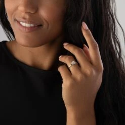 - Beautiful swirl of channel set diamonds on the ring’s shoulders