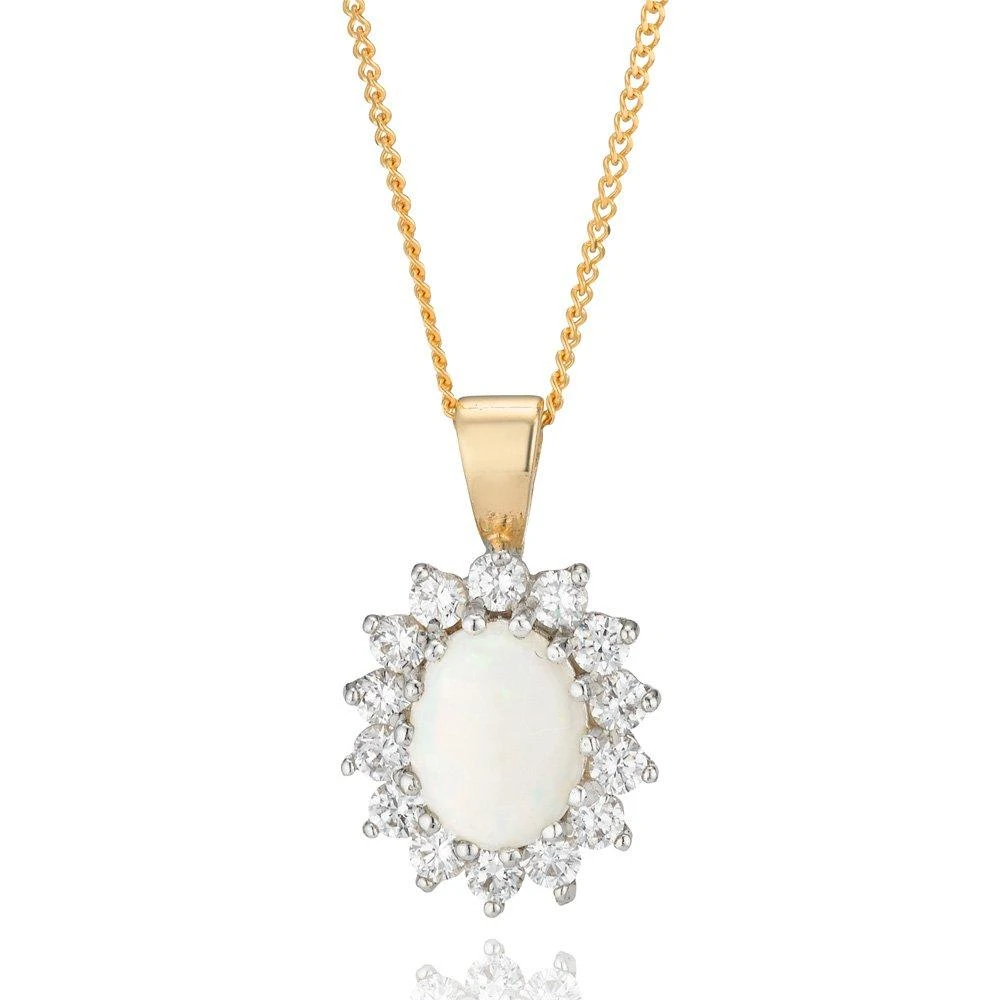 9ct Gold Pendant and Necklace with Opal and Cubic Zirconia .The oval shape and star of cubic zirconias unite to wonderful effect. Pendant length 20mm. Width 12mm. Chain Length 45cm.