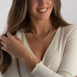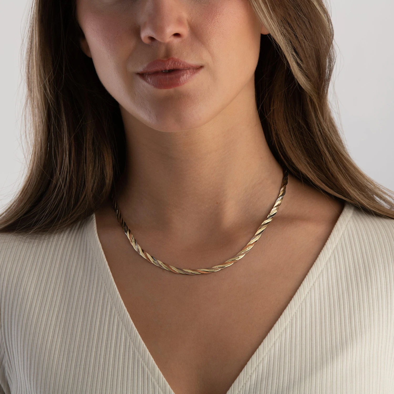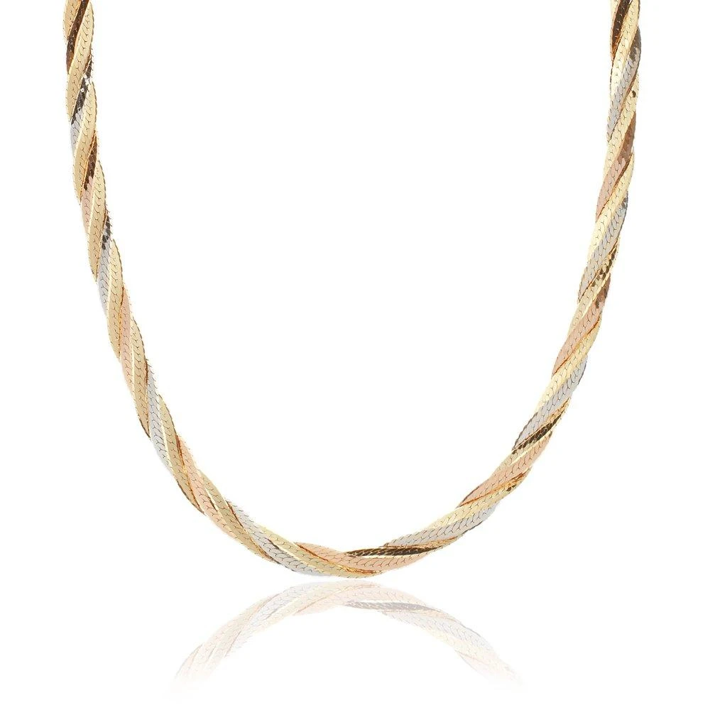 This Necklace in 9ct Multi-Coloured Gold is a classic jewellery piece for her collection. The different hues of these 9ct bands blend beautifully in this classic Gold Necklace. Impress her with this timeless gift. Necklace length 45cm, width 5mm