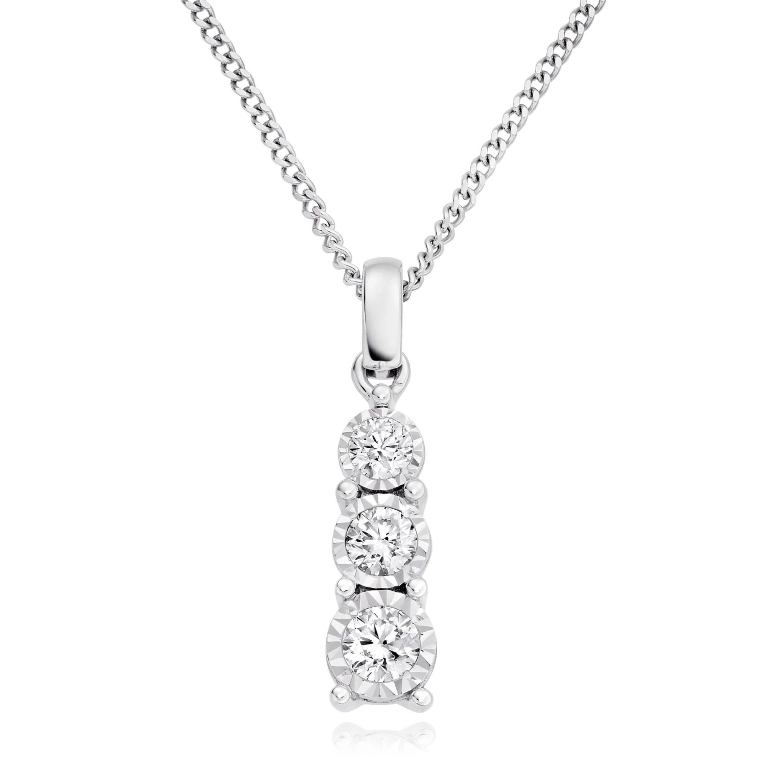 In a beautiful illusion setting sits three beautiful diamonds. This 9ct White Gold Diamond Illusion Pendant is the ideal pendant for soft evening glamour.