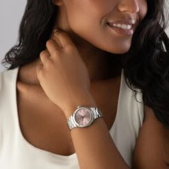 - Pink dial with stainless steel hands and hour markers