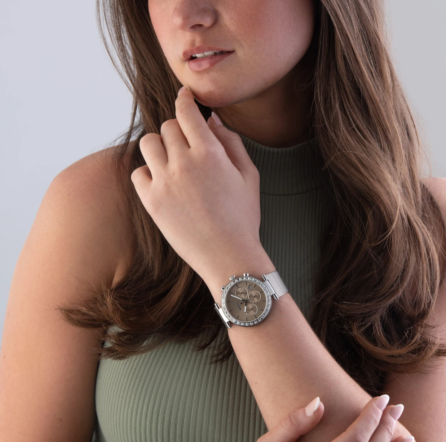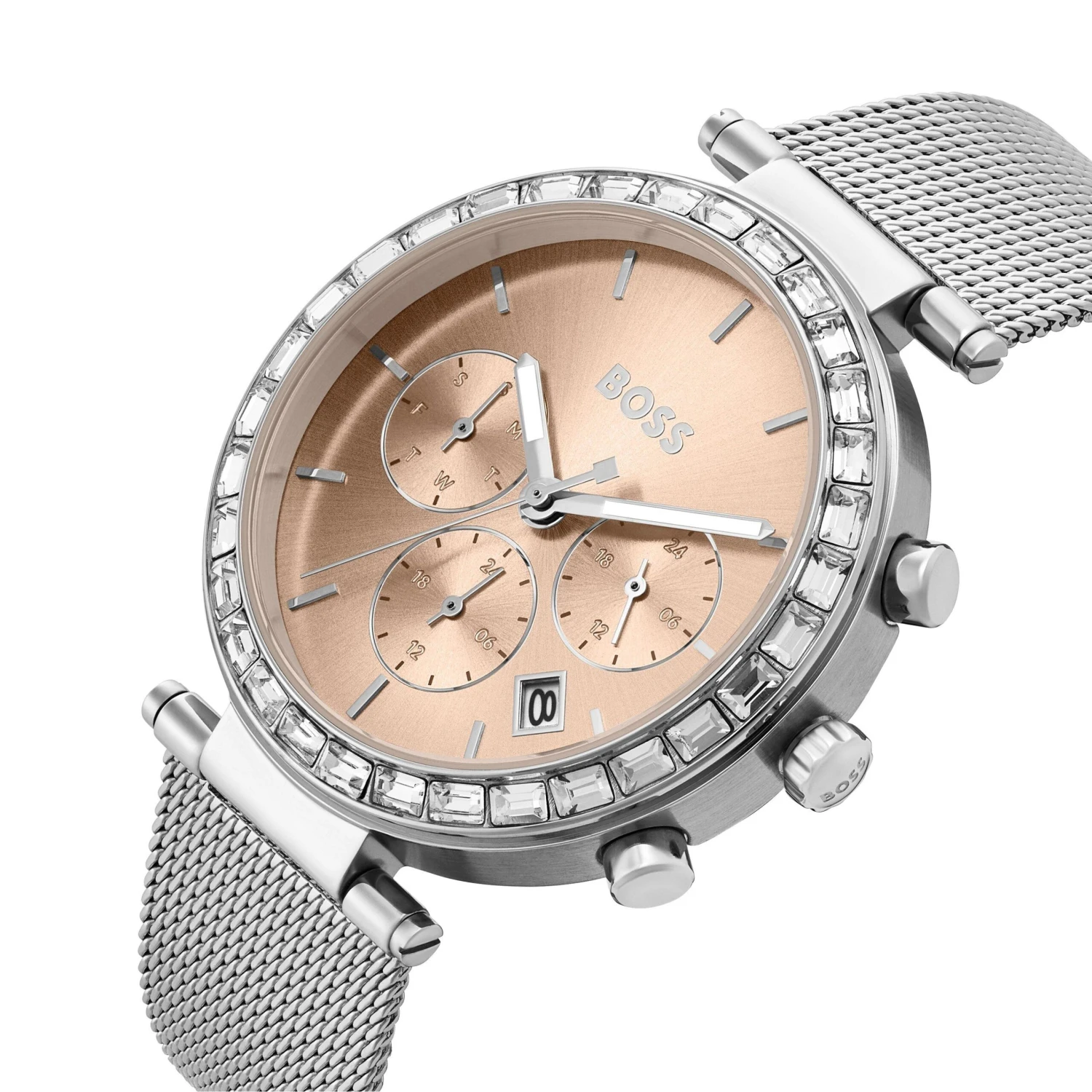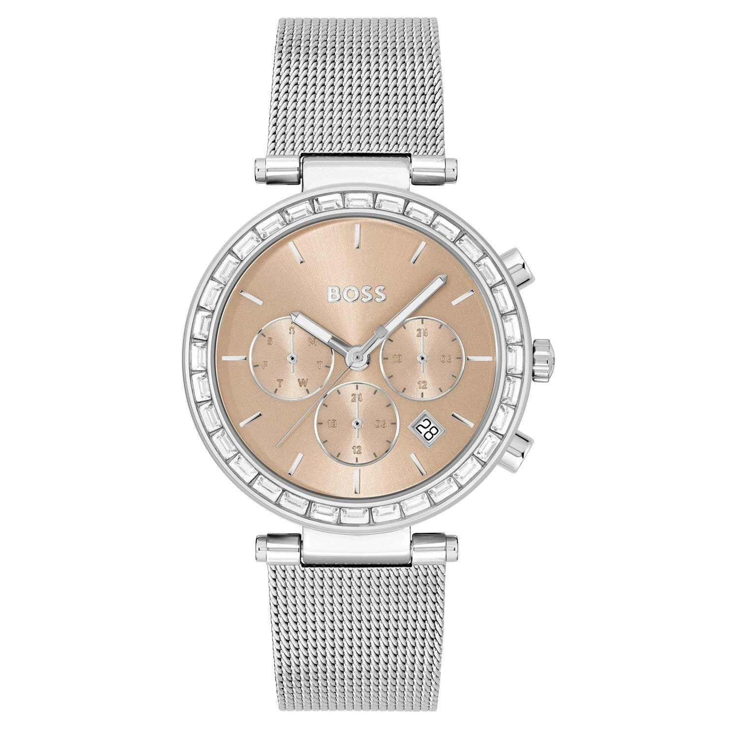 Show off in true designer style with this Boss Andra Crystal Chronograph Quartz Ladies Watch. Showcasing a captivating design adorning an array of crystals, this timepiece is sure to catch the eyes of everyone in the room.