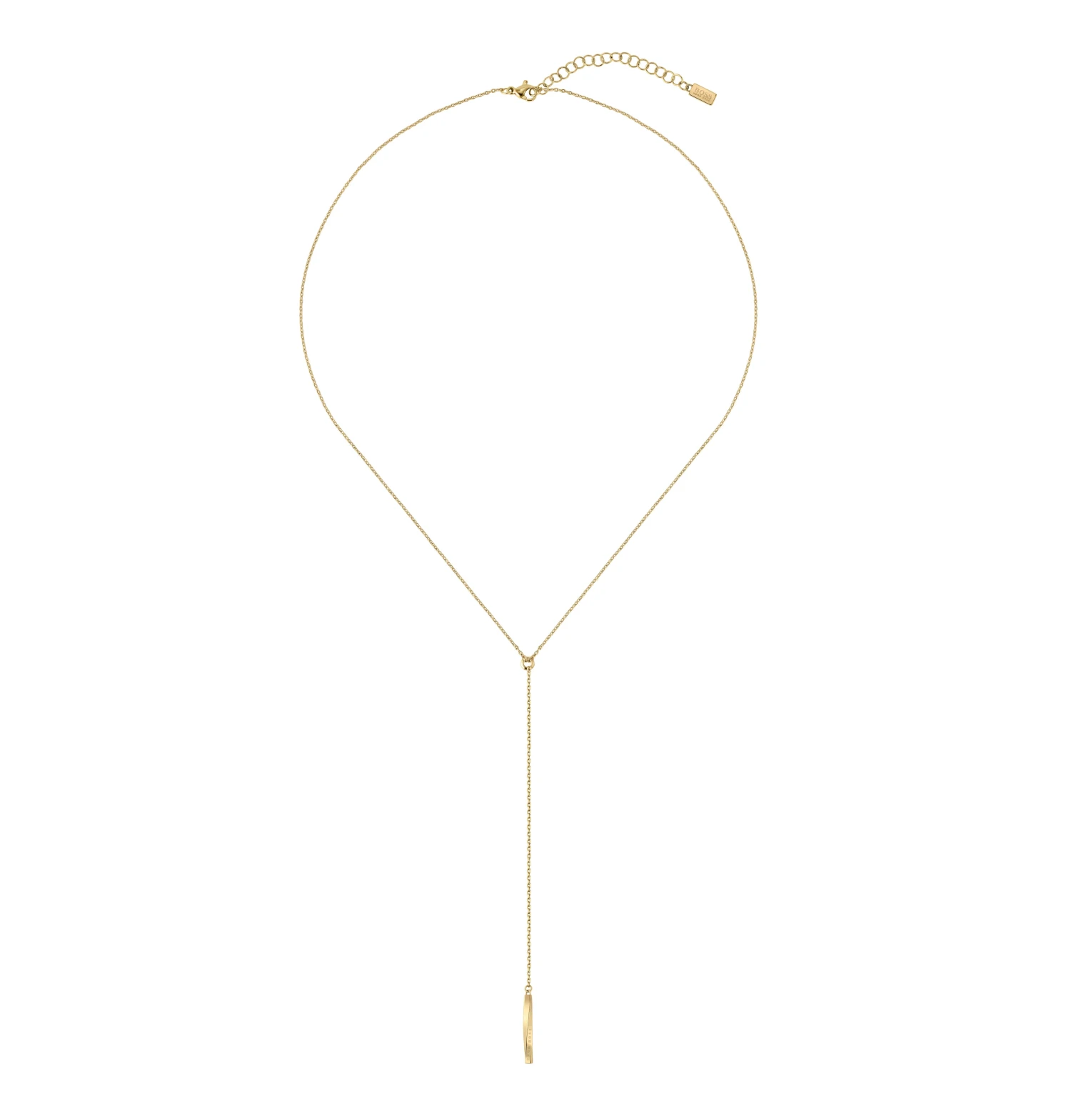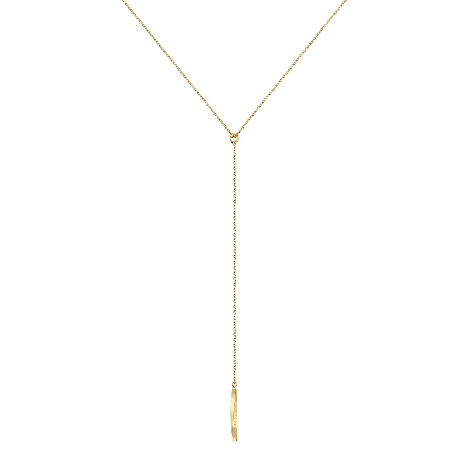 Modern and on-trend, this BOSS Signature Gold Tone Drop Necklace adds style to your every day looks.