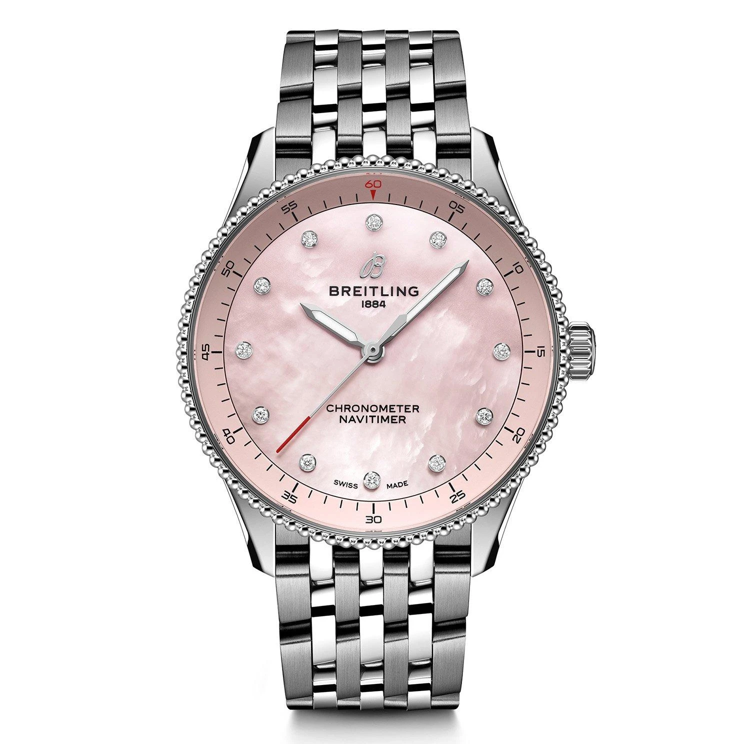 Epitomising refined elegance, this Breitling Navitimer 32 Diamond Mother of Pearl Stainless Steel Quartz Ladies Watch is defined by its flawless style and exceptional accuracy. Showcasing a powdery pink mother of dial adorned with lab grown diamond hour markers, this magnificent design boasts a dazzling new interpretation of a classic design.