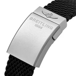 - Presented on a textured black rubber strap with push button folding clasp