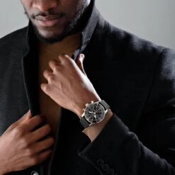 - Black dial with chronograph sub dials