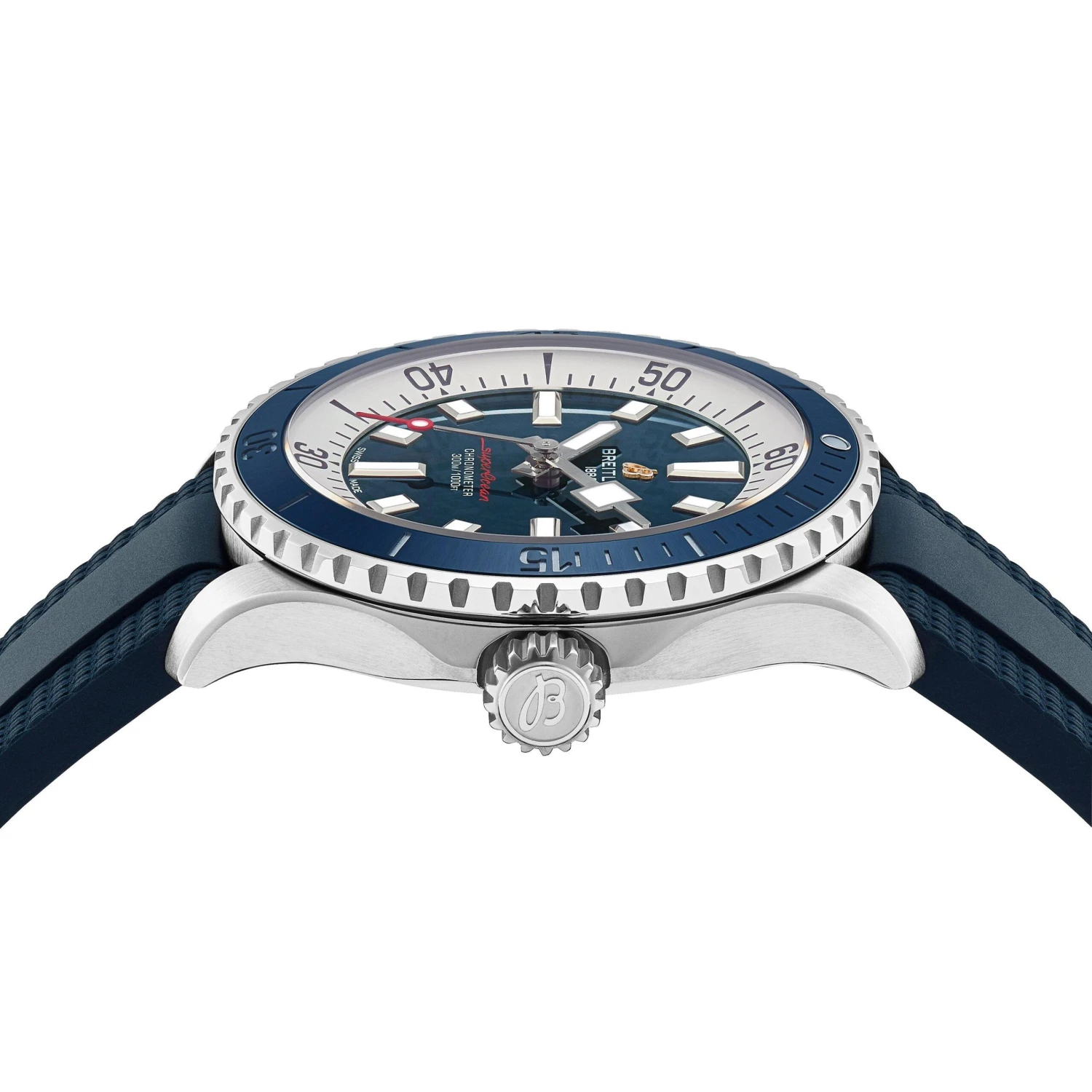 - Blue dial with baton markers, numerals and hands coated in luminescent Super-LumiNova