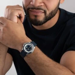 - Presented on a blue rubber strap with folding clasp