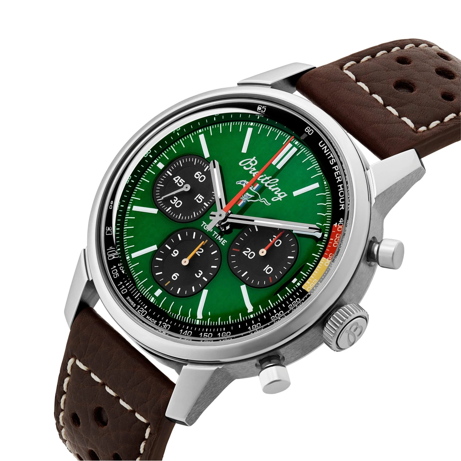 Designed to be unconventional, this Breitling Top Time B01 Ford Mustang Leather Chronograph Men’s Watch radiates the experimentation, fun, freedom and energy the 1960’s is famous for. The first-generation Ford Mustang, produced from 1964 to 1974, became the car of choice for hitting the road in hip 1960’s America. This extraordinary timepiece features the colours and emblem of its classic-car counterpart as well as a perforated leather racing strap, paired with subdials that give the feel of vintage dashboard gauges. Powered by the exceptional Breitling Manufacture Caliber 01, capture the verve of era with this exceptional chronograph.