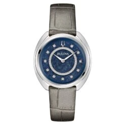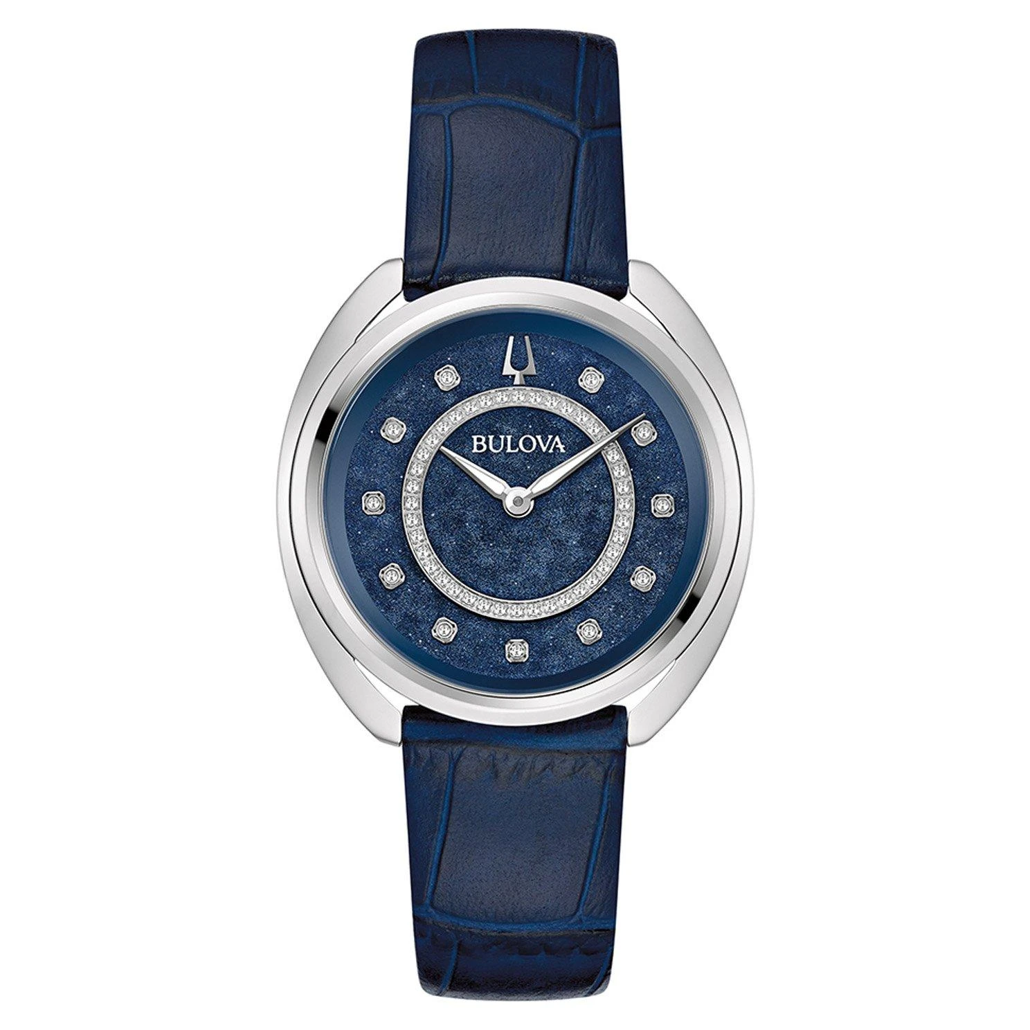 - Blue dial with stainless steel hands and diamond hour markers