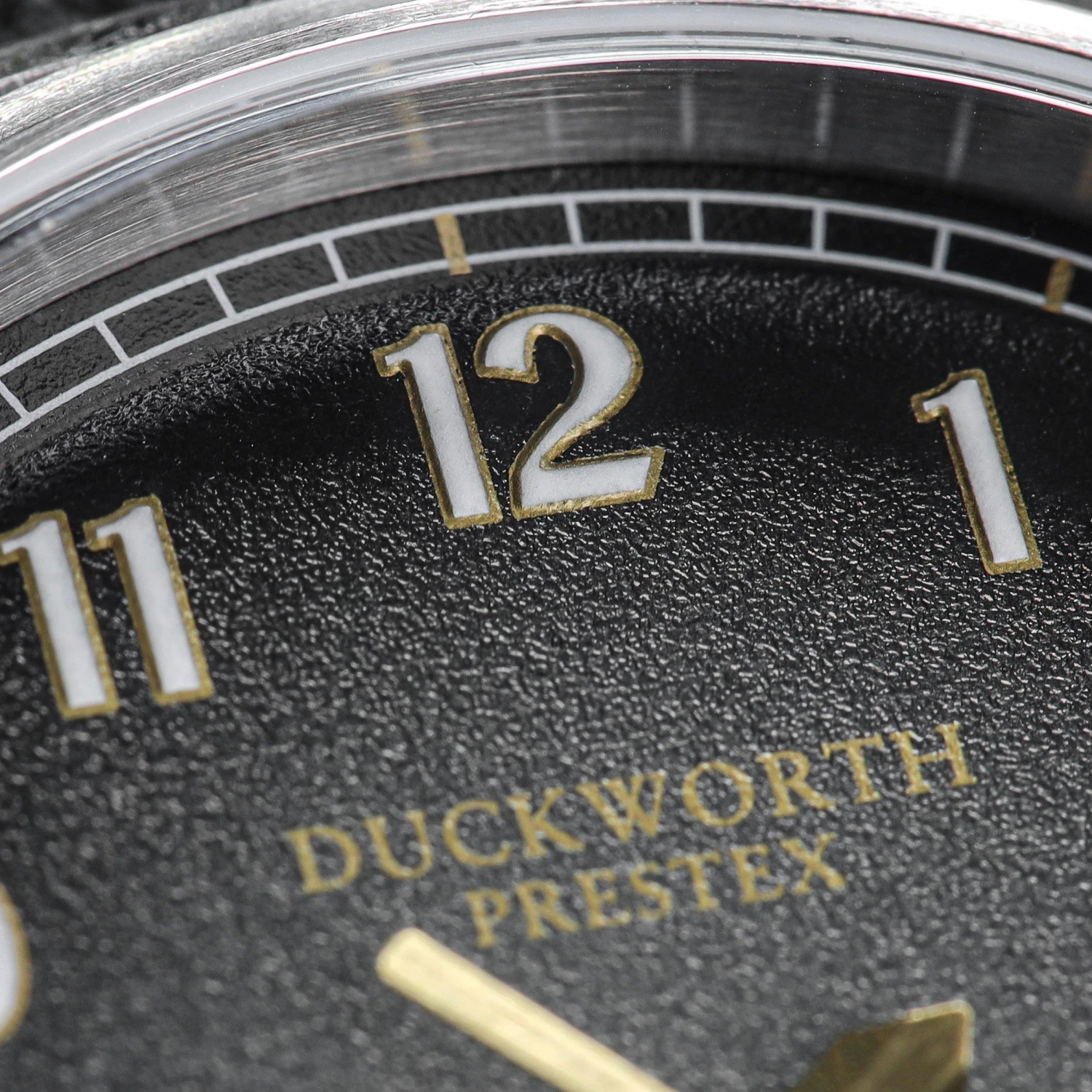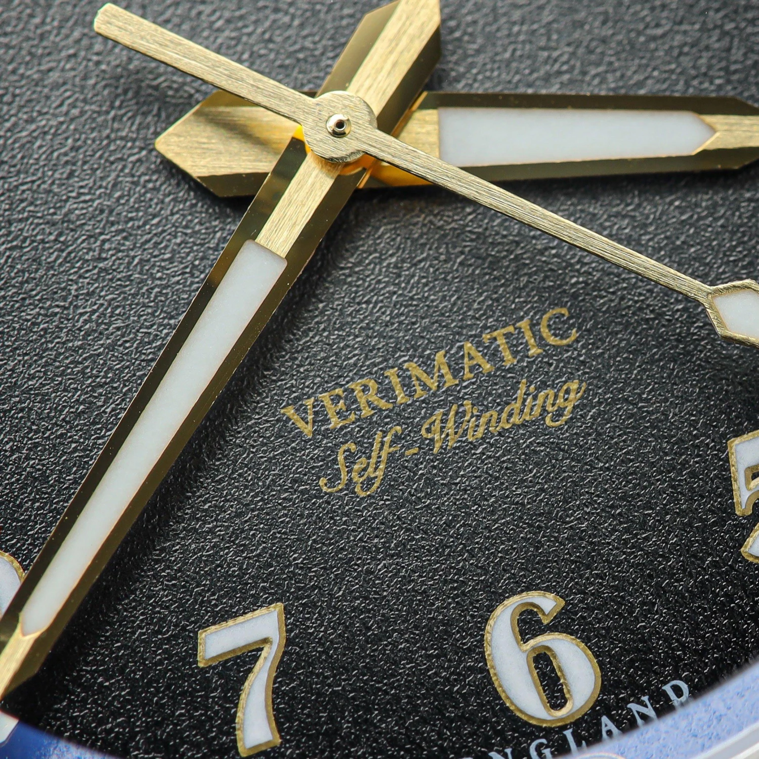 - Textured black fume dial, bold Arabic numerals and contrasting seconds hand