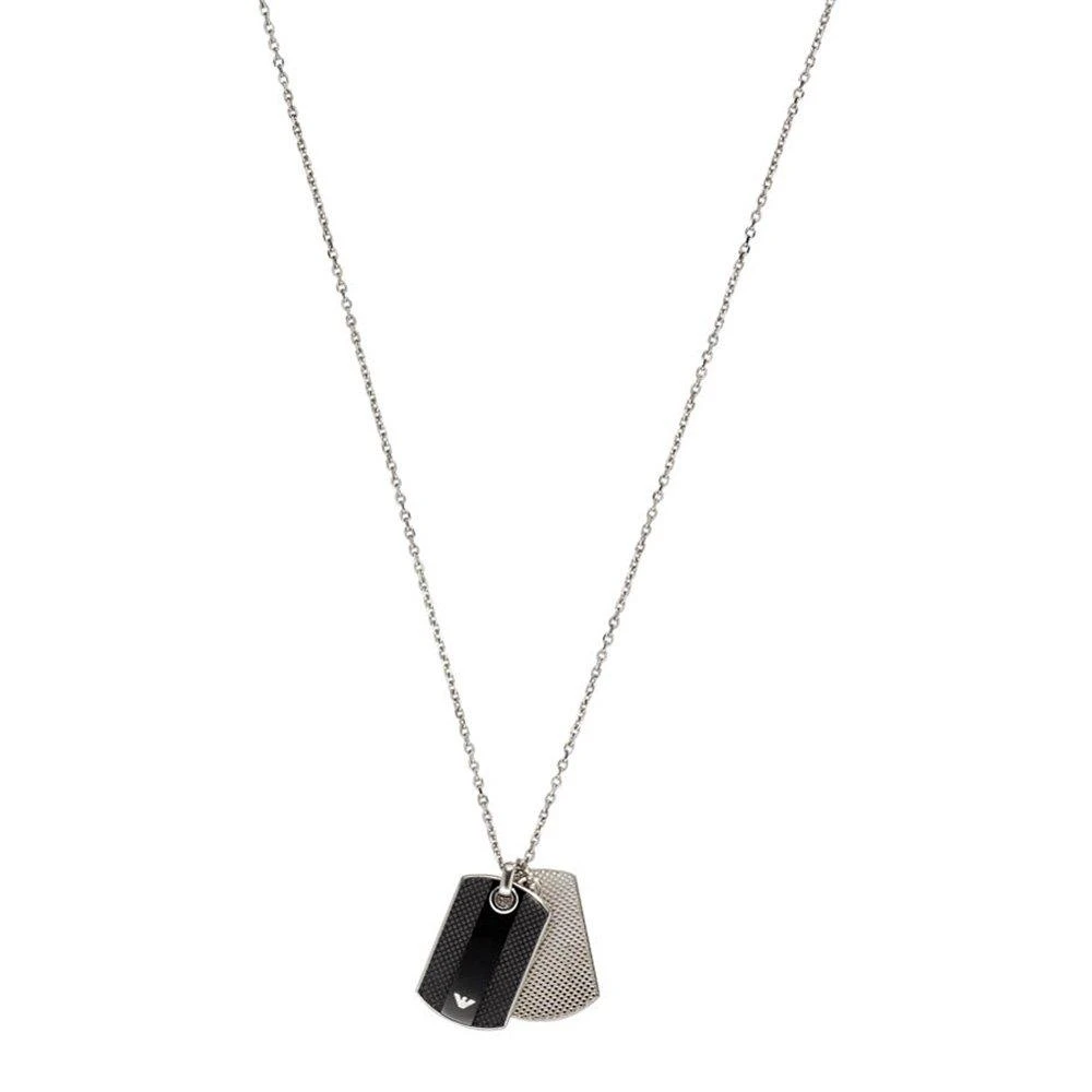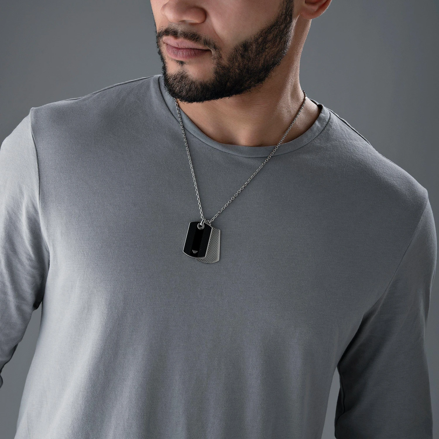 Emporio Armani Steel Dog Tag Men’s Pendant. A sleek stainless steel chain with two dog tags in sterling silver and black colours for contrast and the Emporio Armani logo.