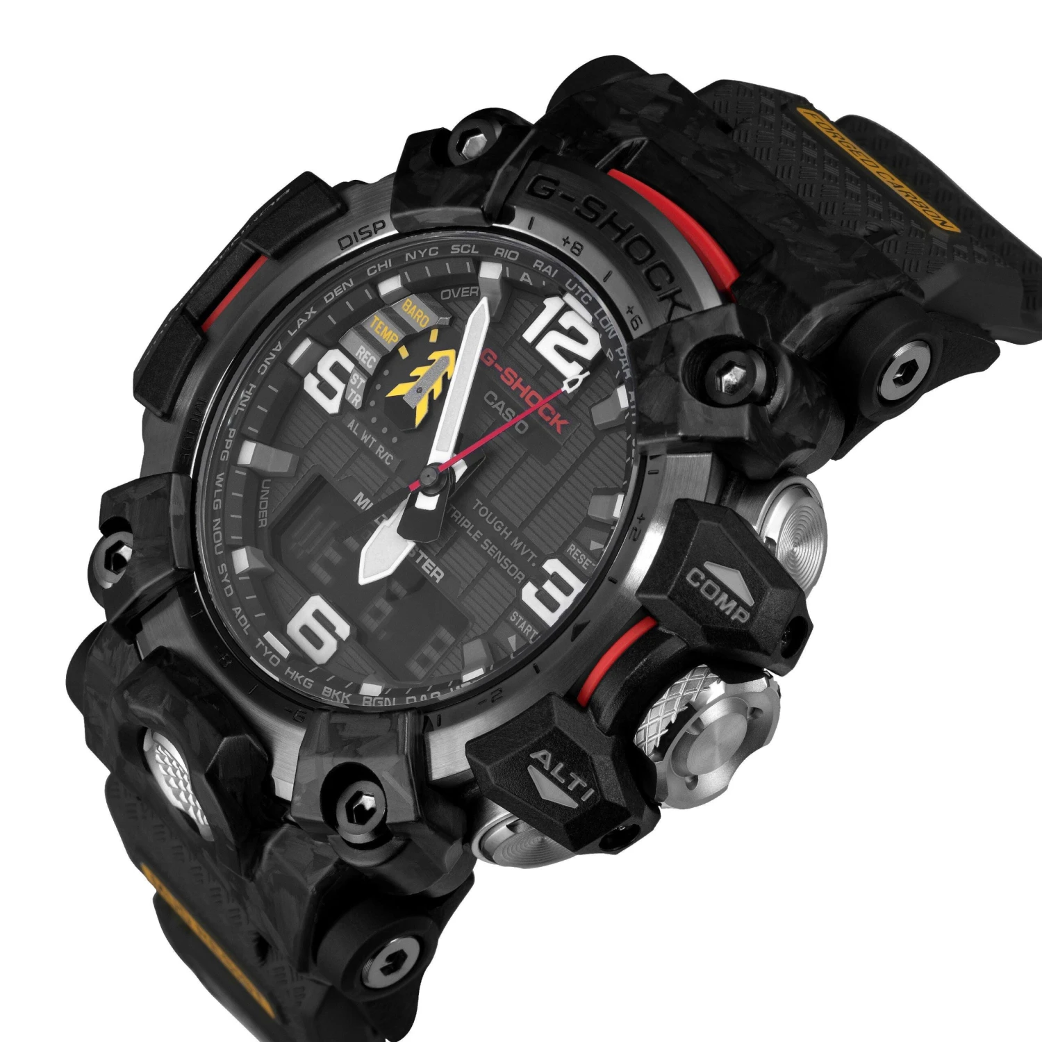 - Black dial with red and yellow accents, digital display and sub dial