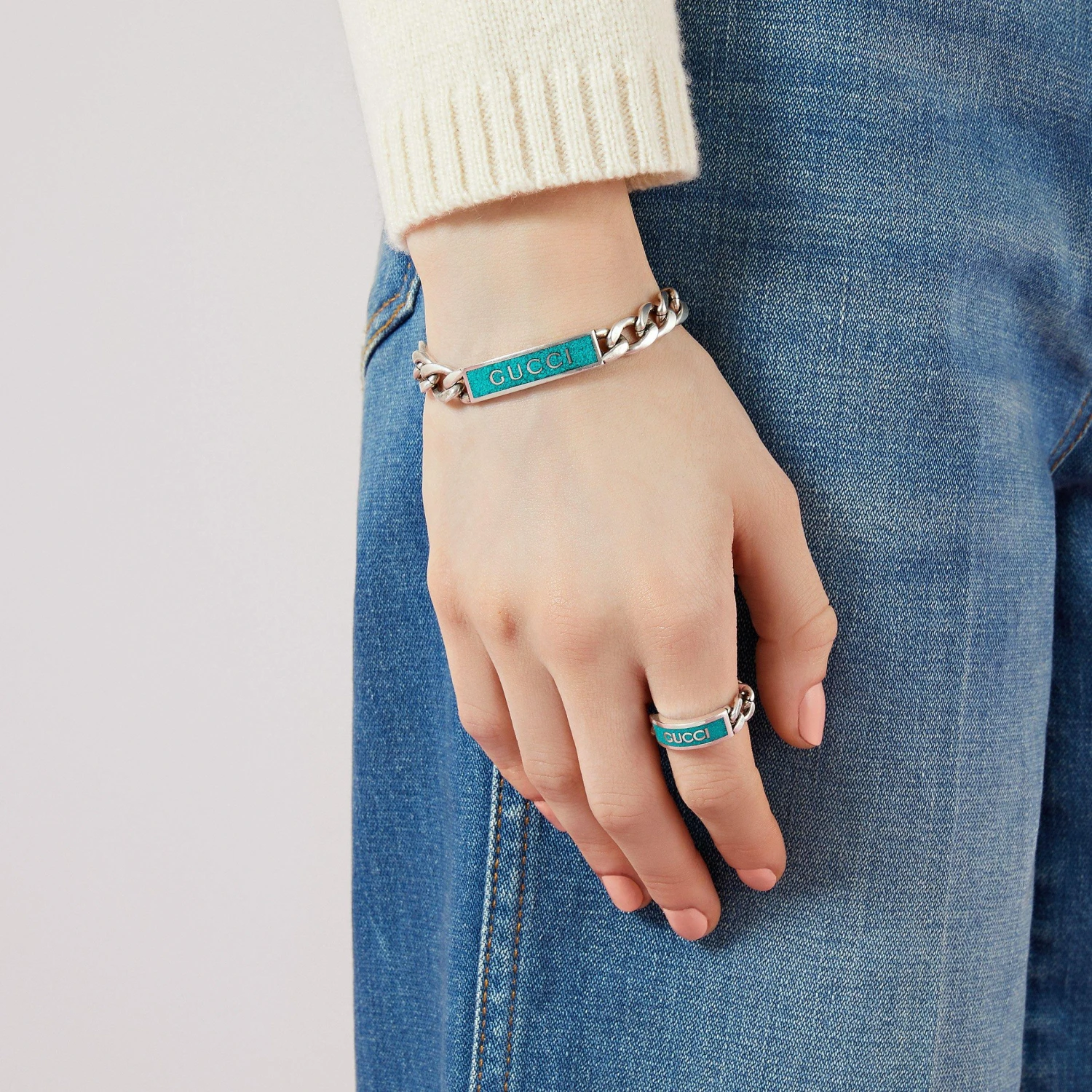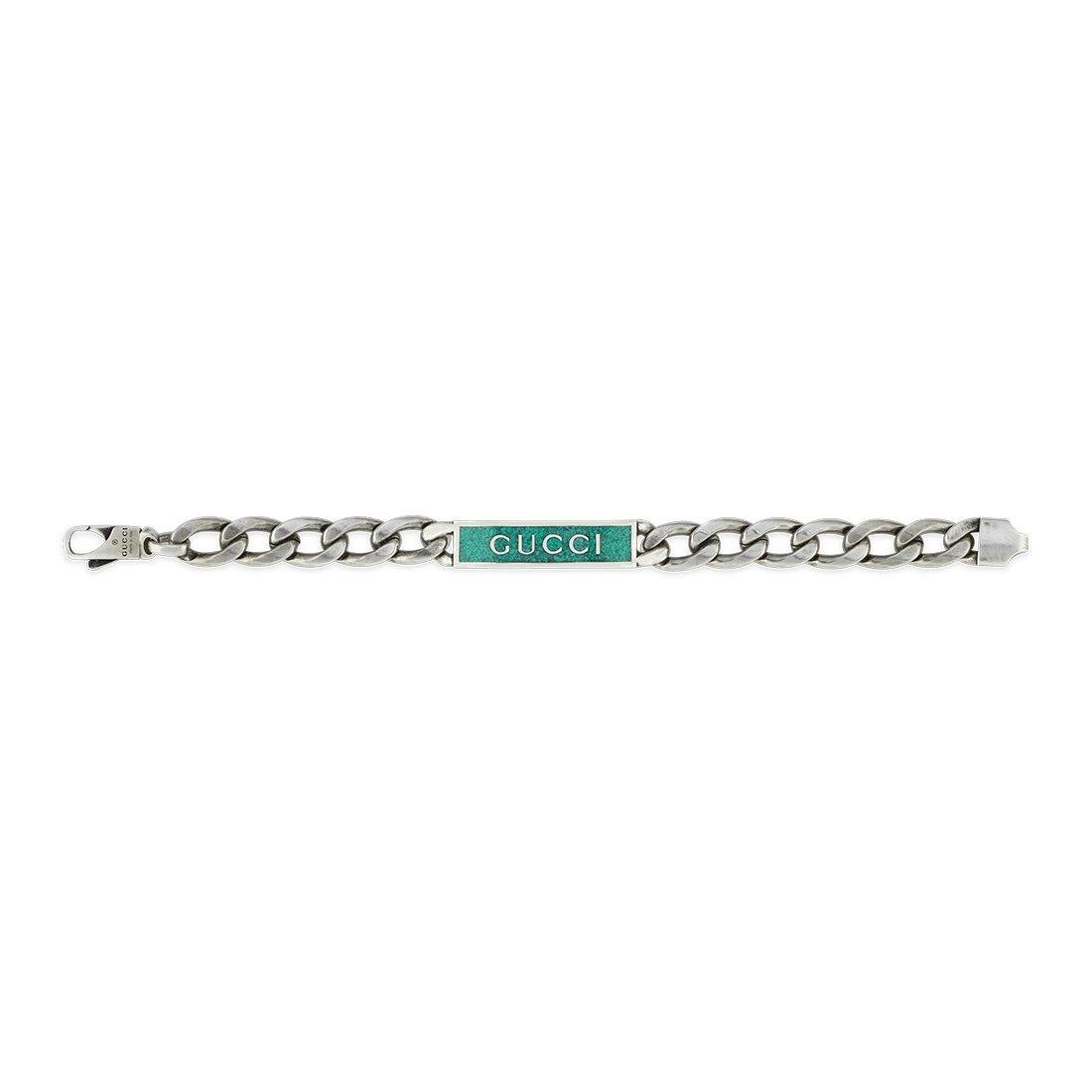 The vibrant shade of turquoise enamel and iconic Gucci logo makes this Gucci Aria Tag Bracelet the perfect accessory to make you stand out.