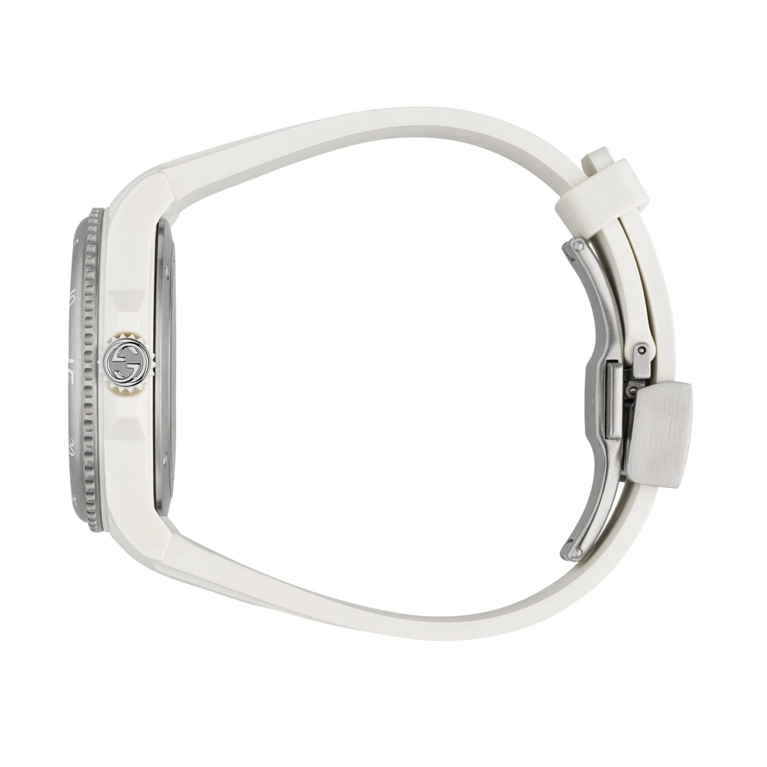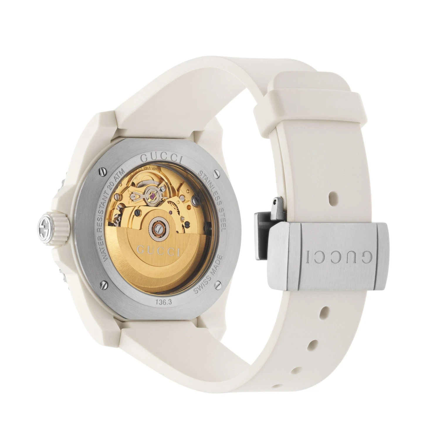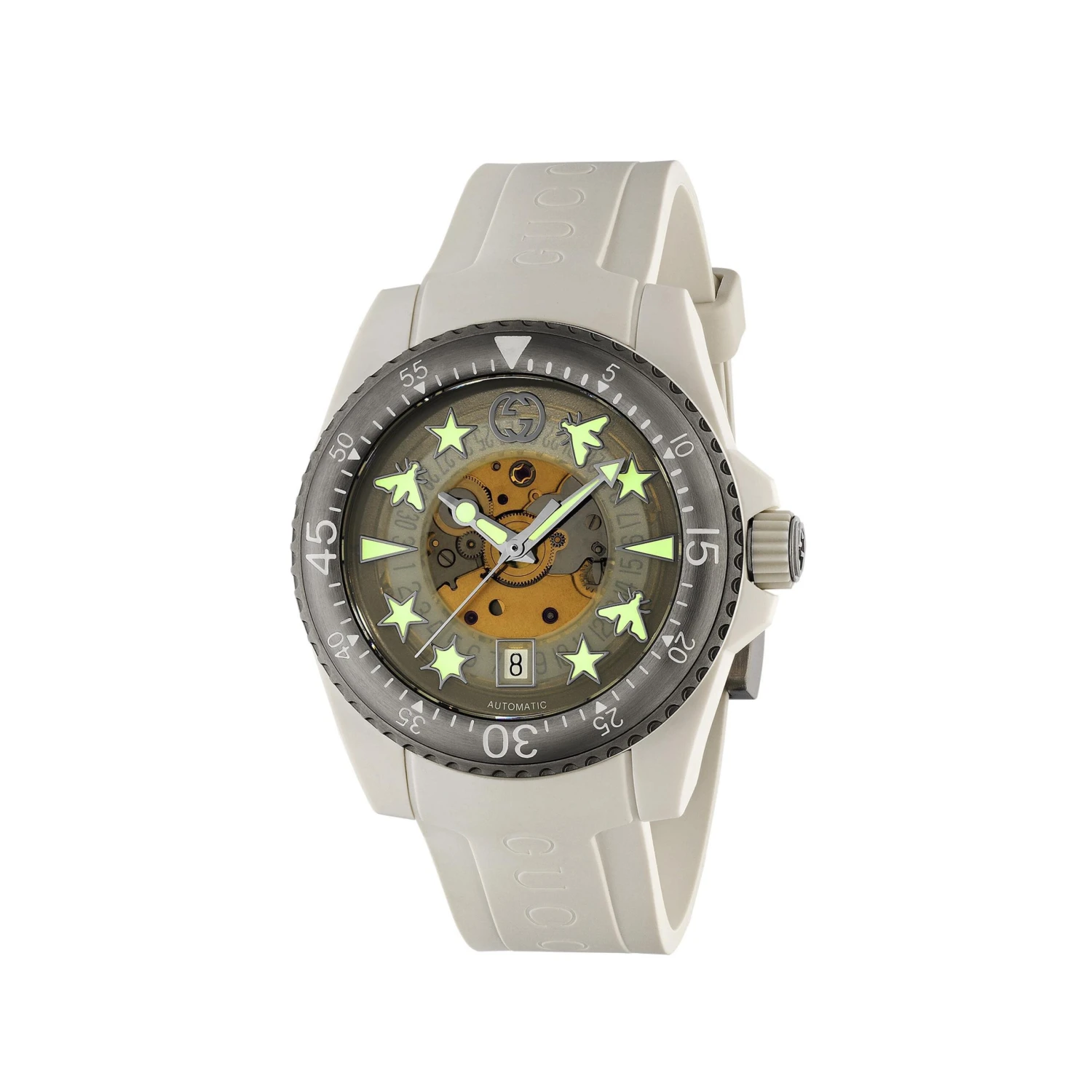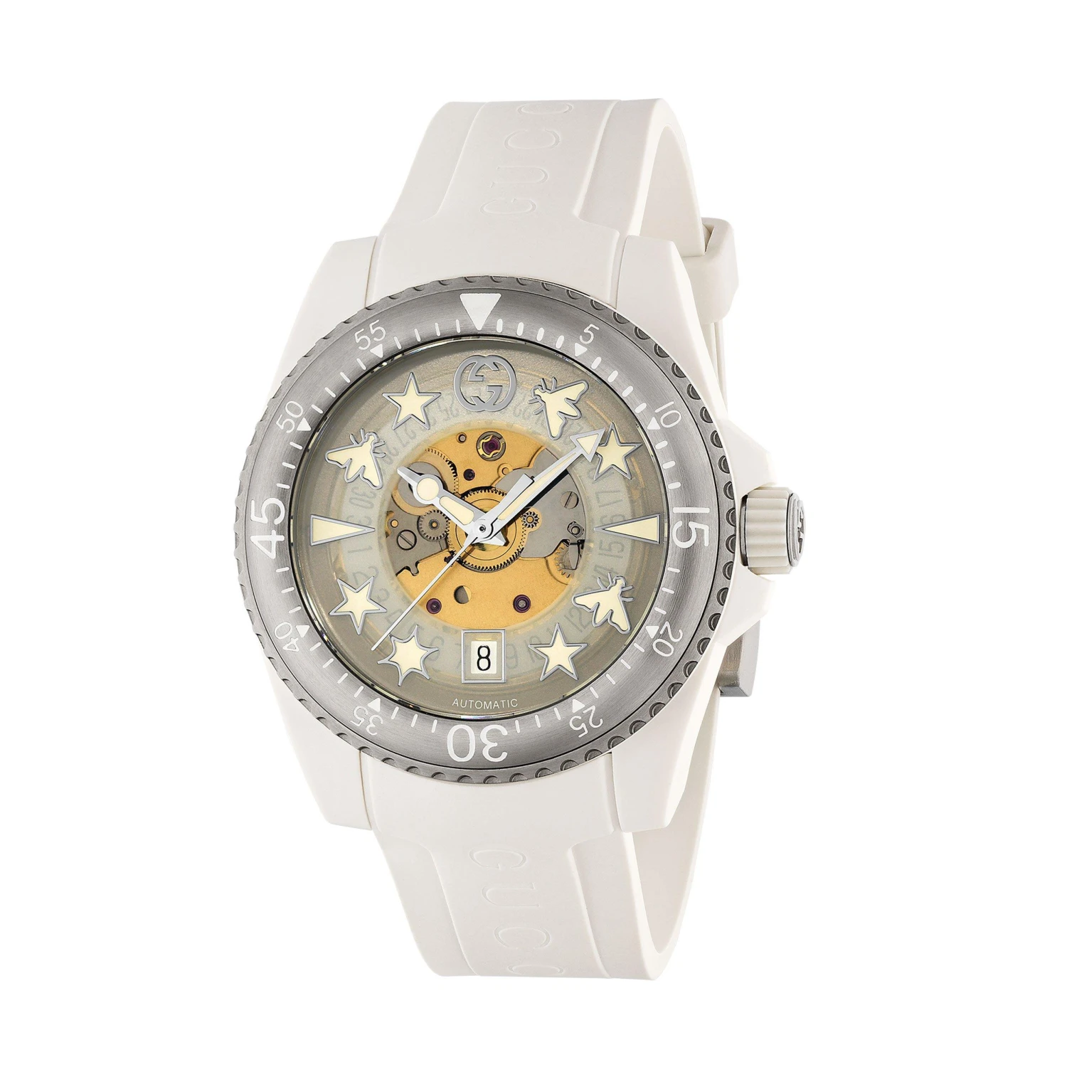 A truly unique timepiece that boasts designer style, this Gucci Dive White Automatic Watch will ensure you stand out from the crowd. Showcasing a mesmerising transparent dial with instantly recognisable Gucci hour markers, this watch fuses luxury detailing with a dreamy design.