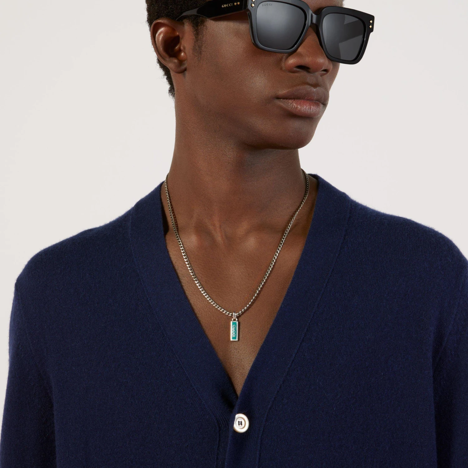 Embracing the timeless nature of the brands classic designs, this Gucci Silver Aria Tag Pendant has vibrant turquoise hues blended with subtle logo detailing to create the perfect addition to every look.