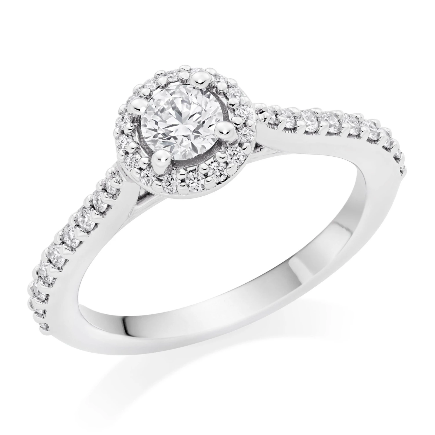 Simply breathtaking, this Hearts on Fire Platinum Diamond Halo Ring is loved for its intense fire, sparkle and brilliance, from the central diamond, diamond halo and diamond set shoulders.