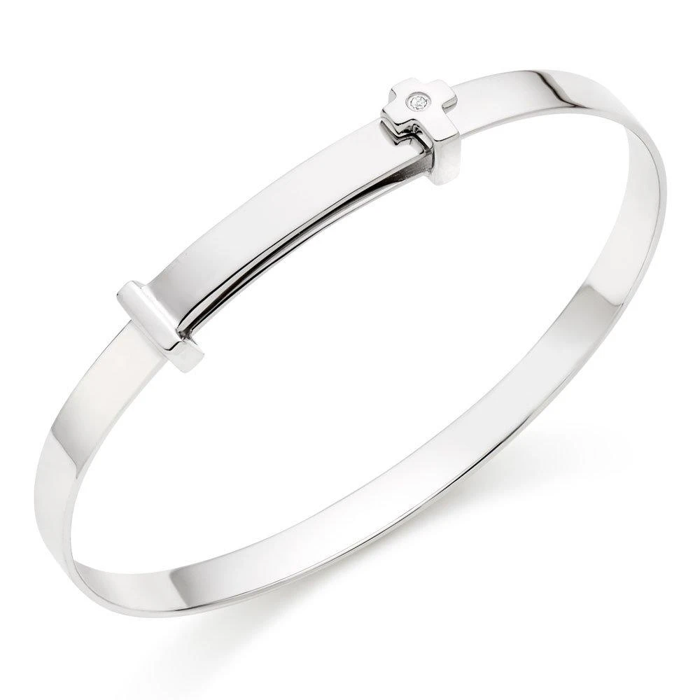 A special piece for your little loved one, this Mini B Silver Diamond Cross Bangle is simply stunning.