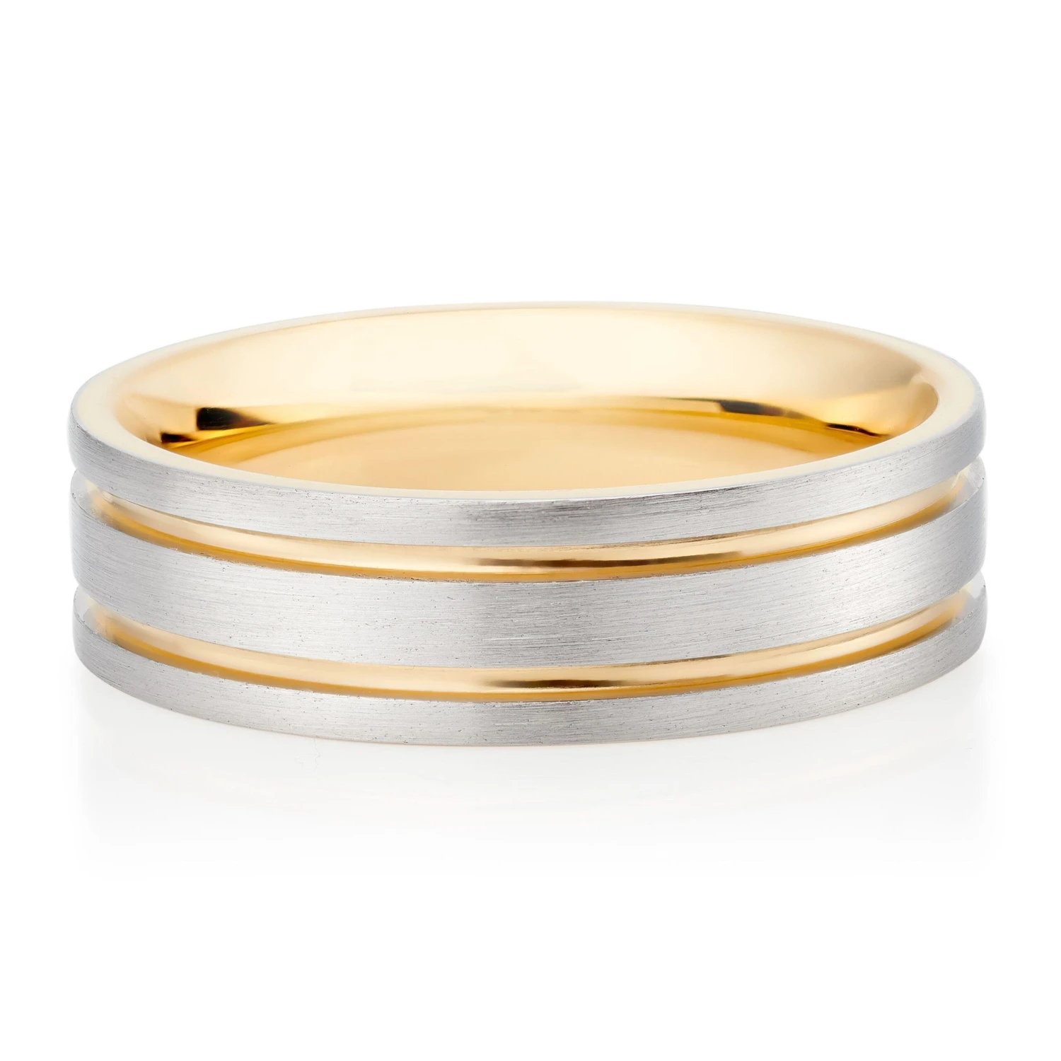 - Platinum outer band with 2 18ct gold channels and 18ct gold inner band