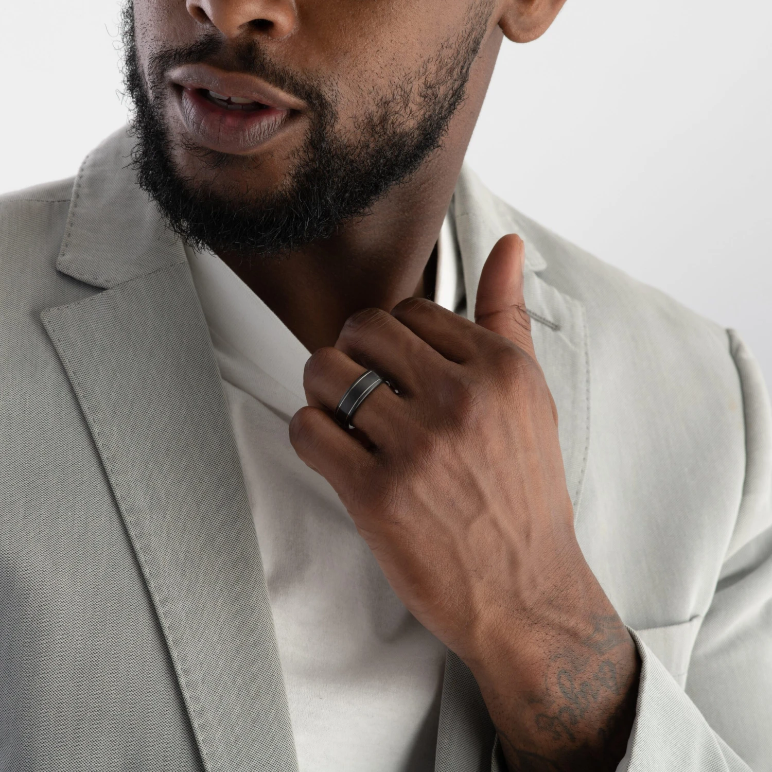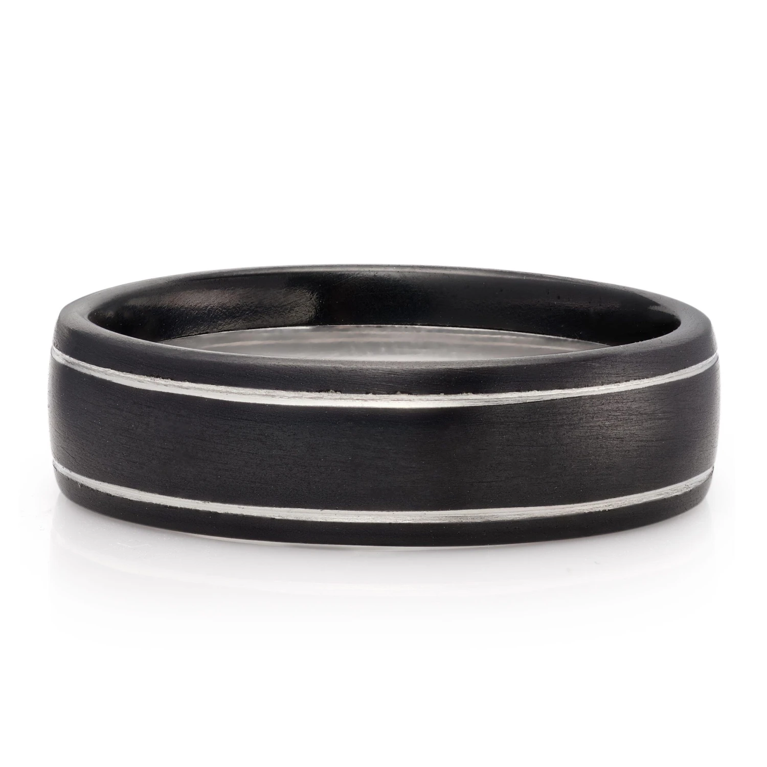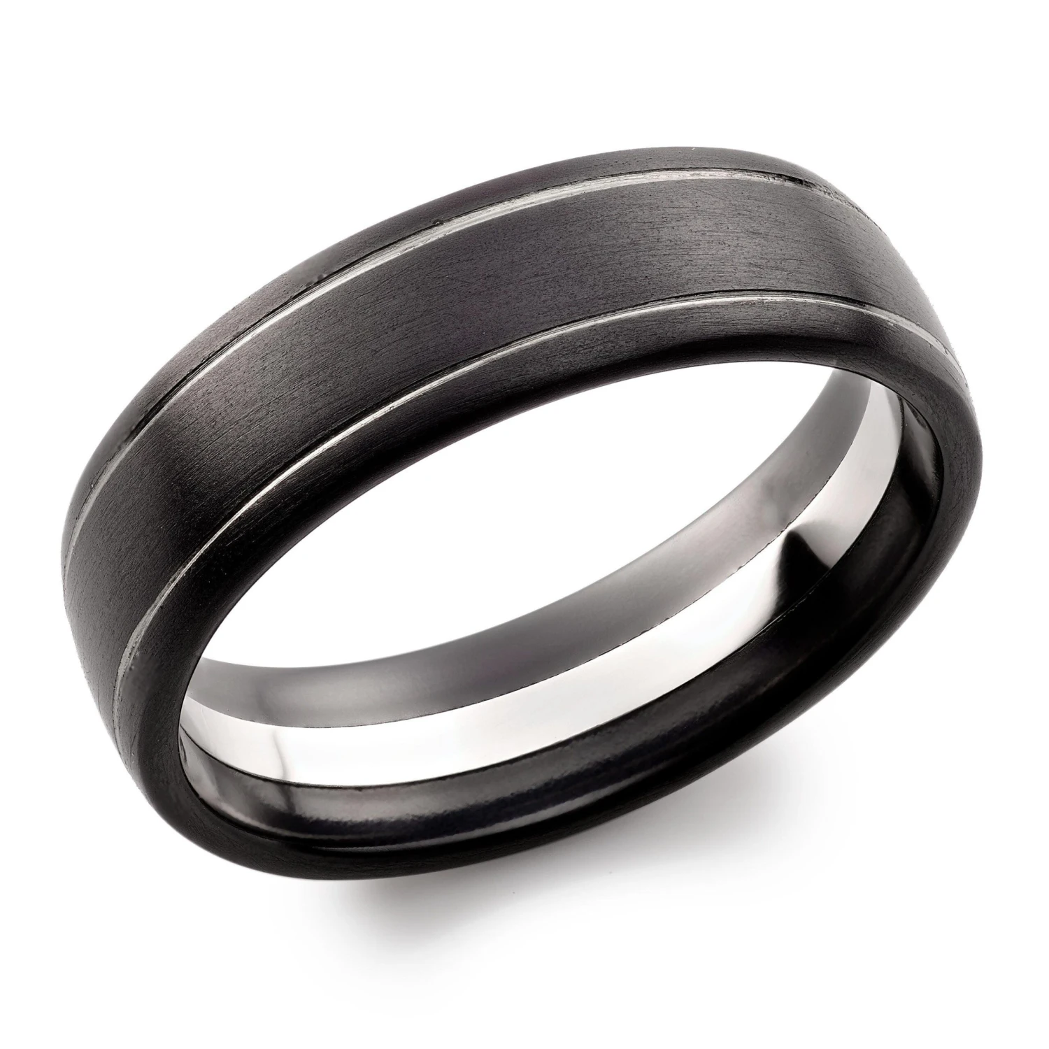 Put a contemporary and exciting twist on the ring that will represent your everlasting love for one another, with this Platinum and Zirconium Black 7mm Wedding Ring. A striking and unique design, made for those who love to make a statement of style.