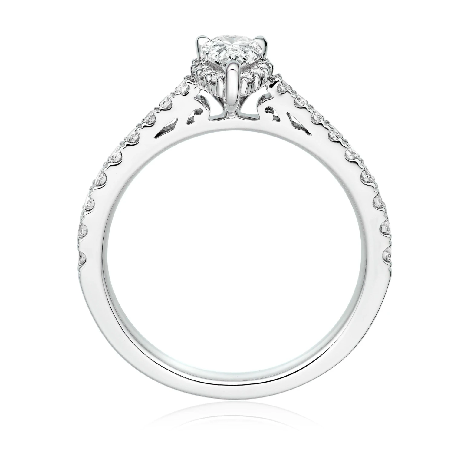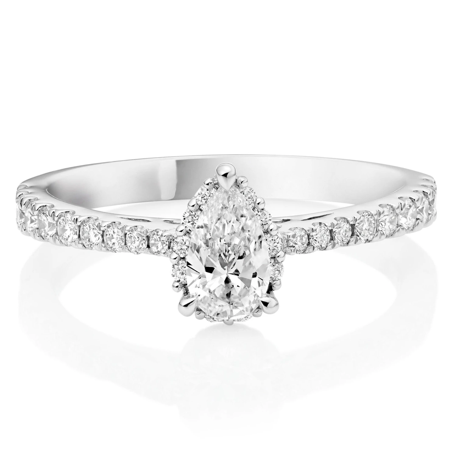 - Pear shaped carefully hand selected diamond takes centre stage