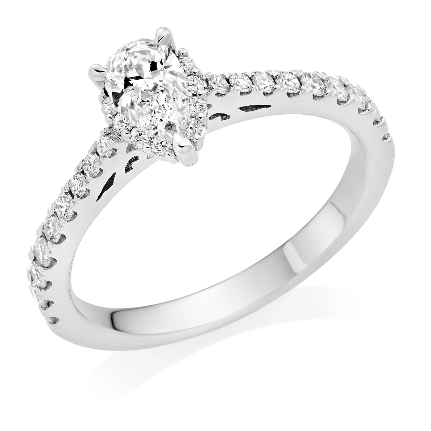 Radiating the most stunning sparkle, this Platinum Pear Shaped Diamond Halo Ring is the perfect way to display your eternal love for someone special.