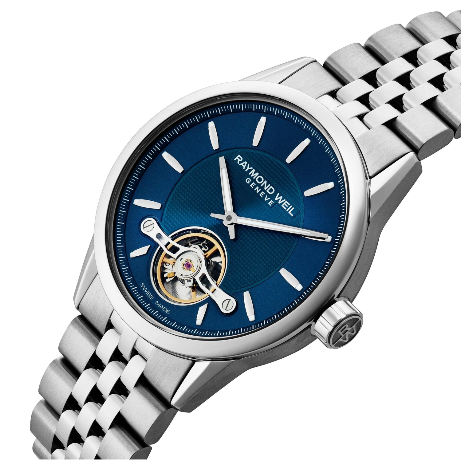 A boldly distinctive design, this Raymond Weil Freelancer Automatic Men’s Watch boasts an openworked dial that reveals the regulating organ at 6 o’clock to show off the beautiful and intricate craftsmanship.