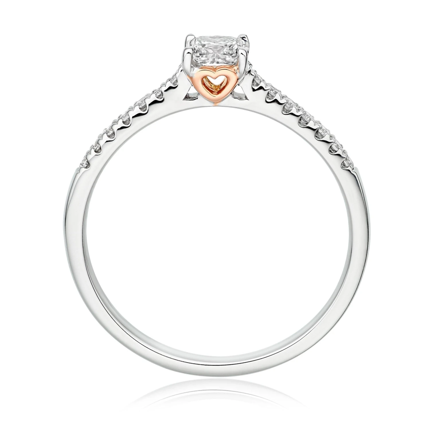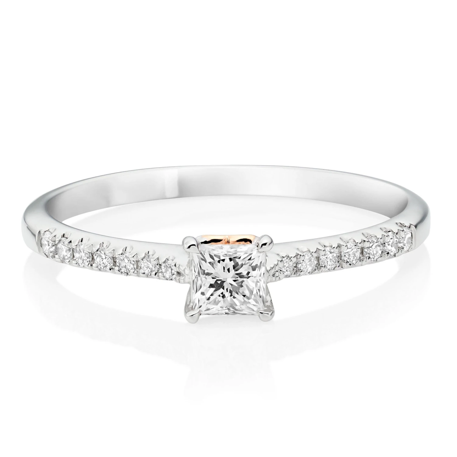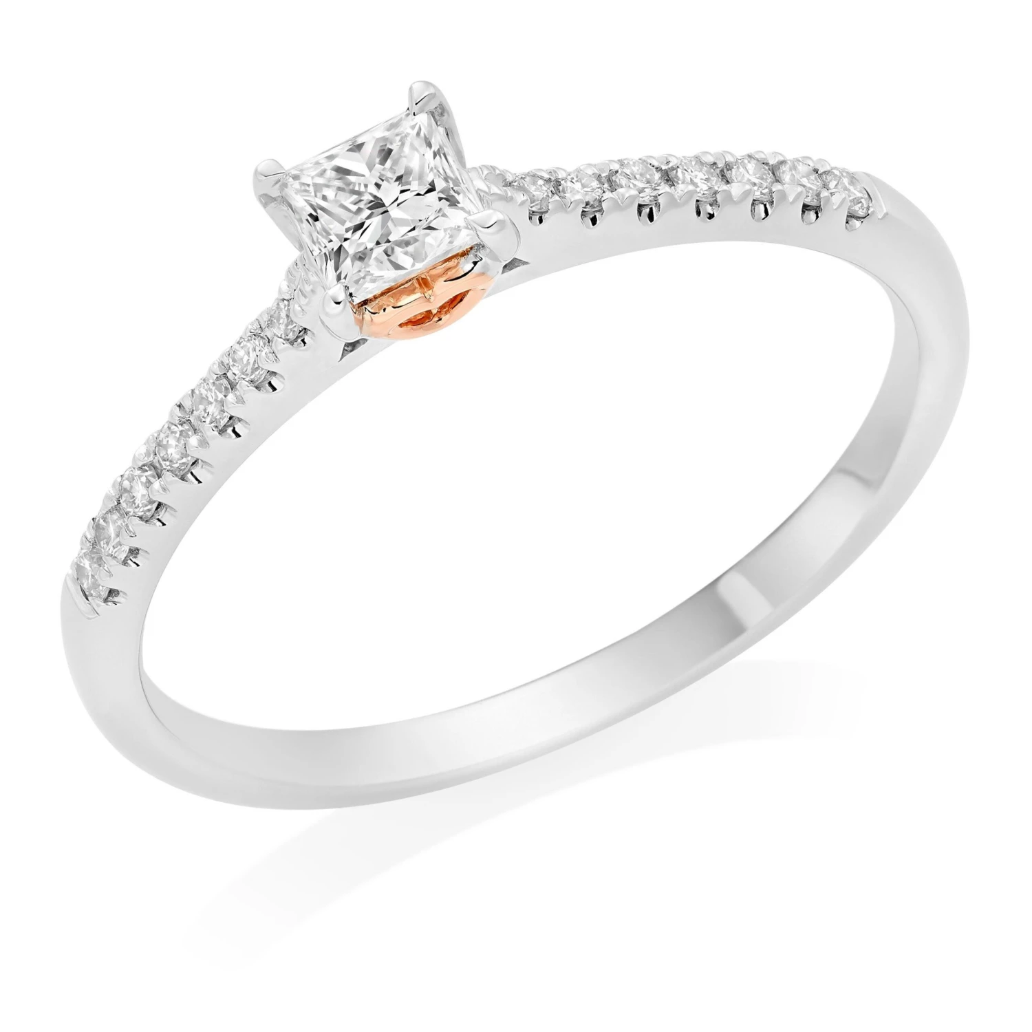 Shine like the princess you are in this Rose Hearts 18ct White Gold and Rose Gold Diamond Princess Cut Solitaire Ring. The stunning mix of rose gold and white gold creates an elegant stage for the sparkling diamond to stand upon.