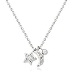 Shine bright like the night sky with this Silver Cubic Zirconia Moon And Star Necklace. The star and moon motifs sit freely next to each other with cubic zirconia embellishment, sparkling just like in the night sky.