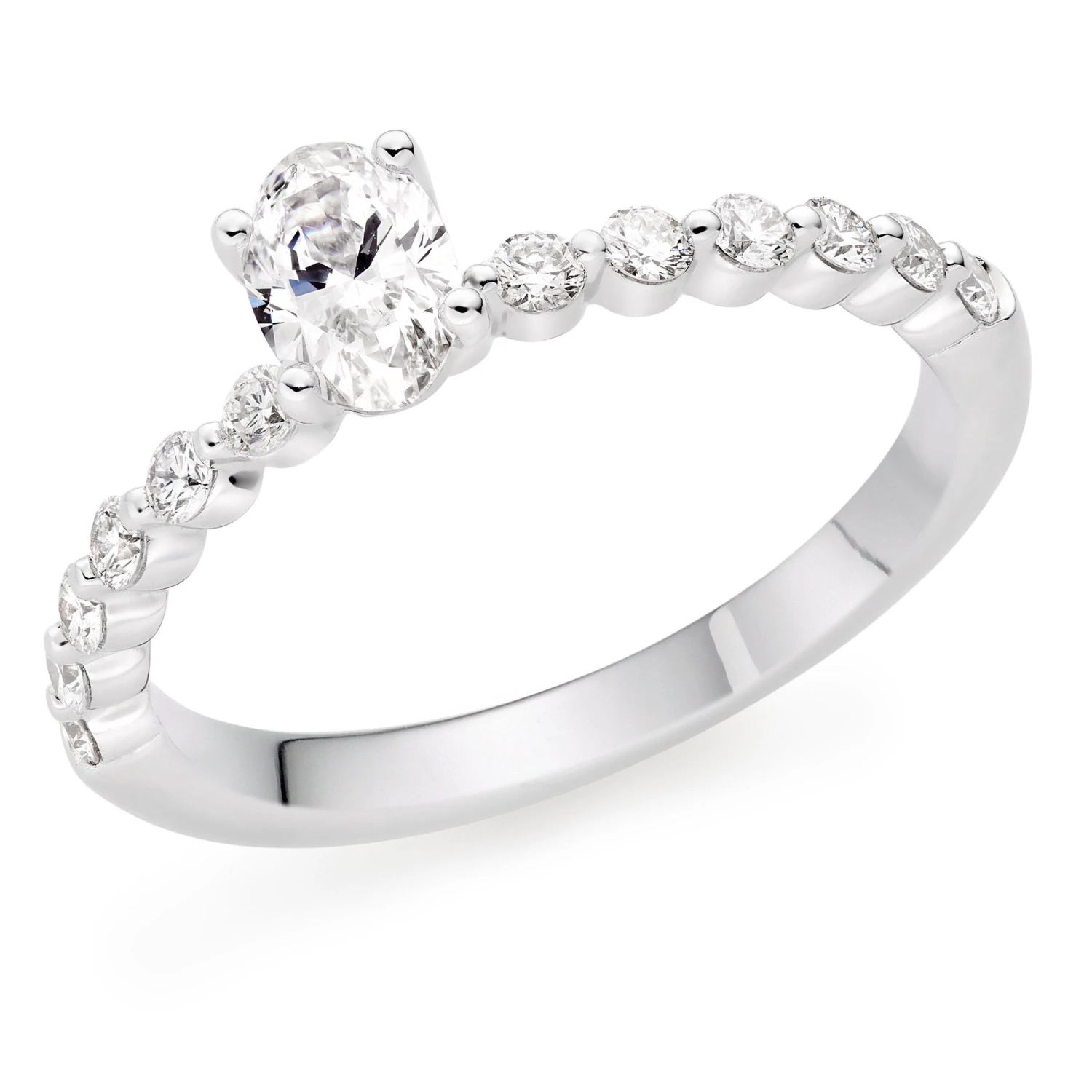 For a sparkle and scintillation that’s out of this world, this Starlit Platinum Diamond Oval Cut Ring has been beautifully designed for the brightest star in your life. Crafted with a polished platinum band, the array of beautiful diamonds creates the illusion of a scalloped edge, radiating together in a unique shared setting to represent the stars that light the universe.
