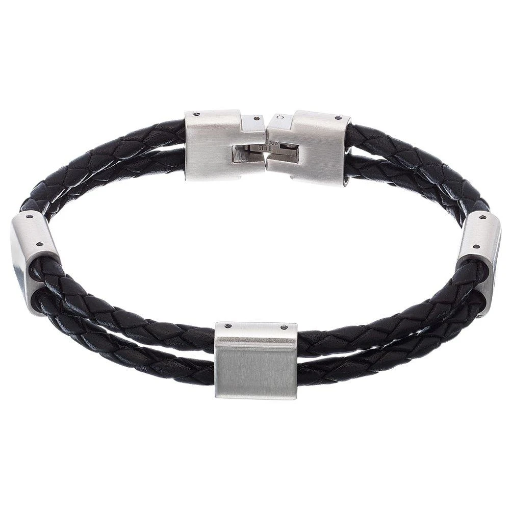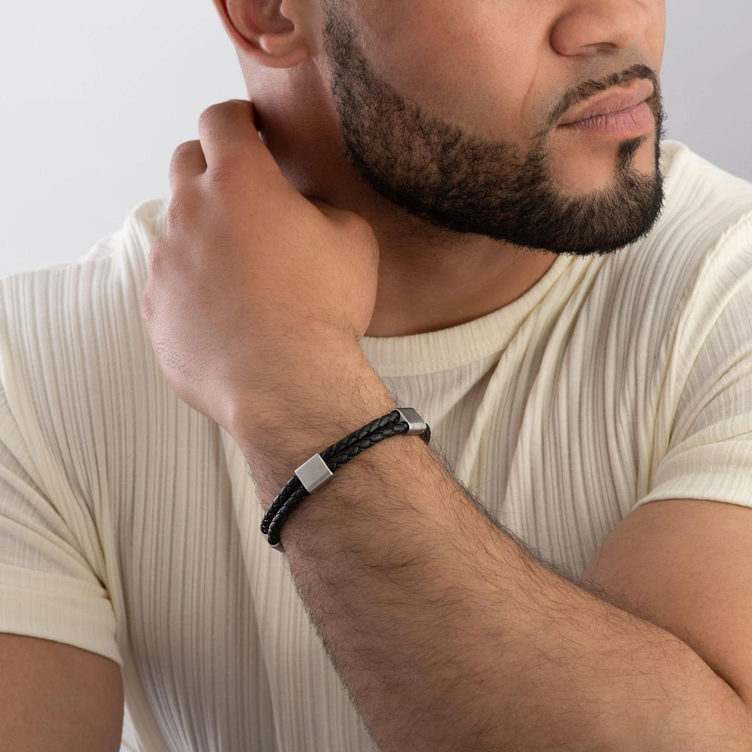 Steel and Black Leather Men’s bracelet. A stylish double row plaited black leather bracelet with steel plates inserted along the bracelet for an added dimension giving it an industrial feel.