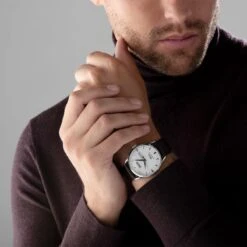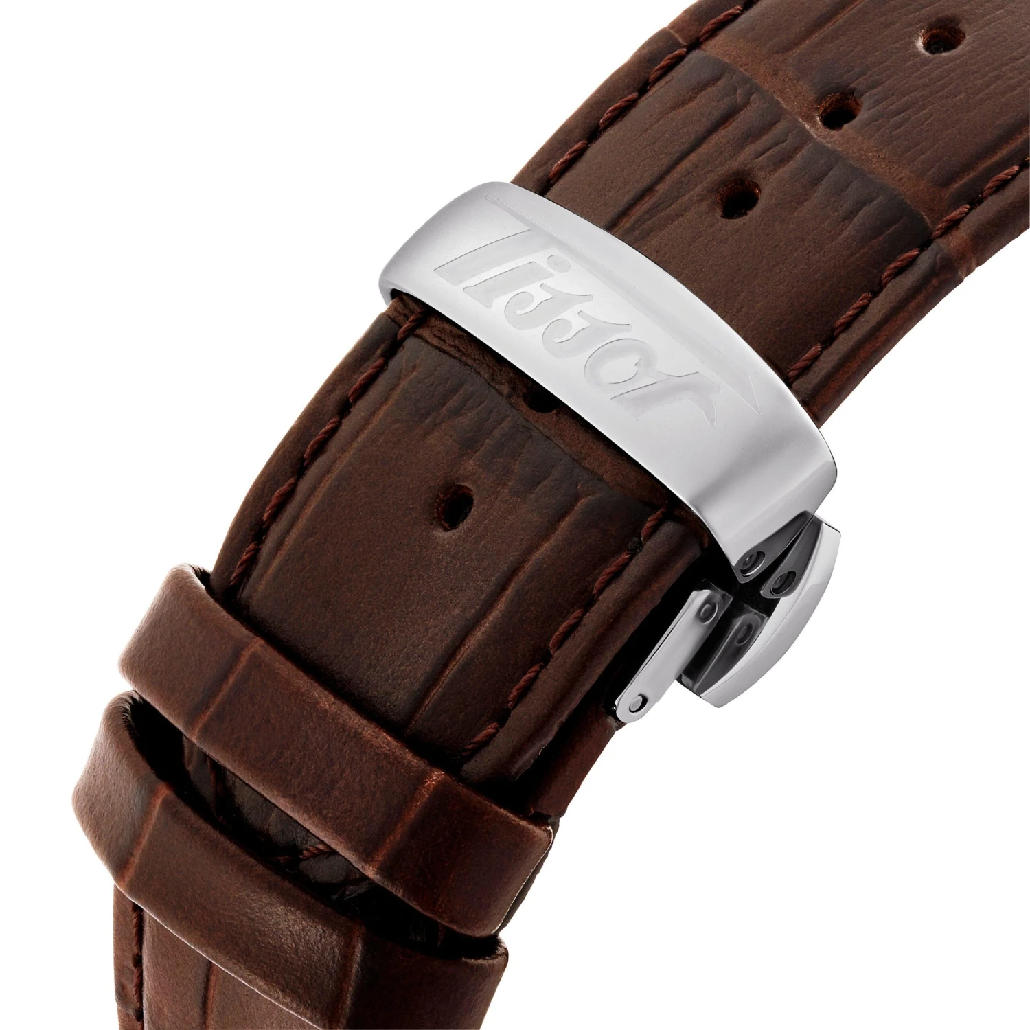- Presented on a brown embossed cow leather alligator look alike strap with butterfly clasp