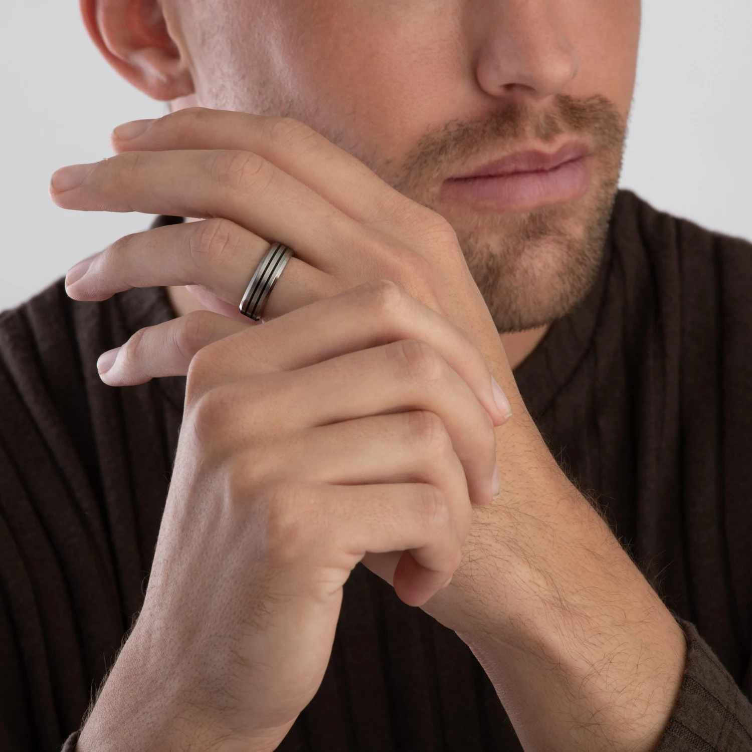 Modern, urban and edgy, this handsome Titanium and Black Rhodium Men’s Ring will add a tough, masculine edge to your look every day of the week. Designed in ultra modern titanium which is both lightweight and hard-wearing, this contemporary ring is given a distinctive finish with its black rhodium banding. Guaranteed to look as good with your tailored suit as your favourite pair of jeans, this masculine ring will set you apart from the crowd.