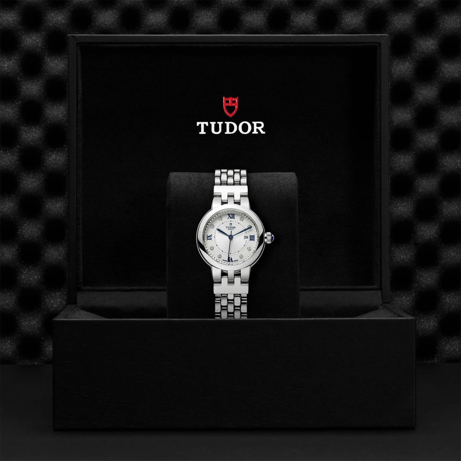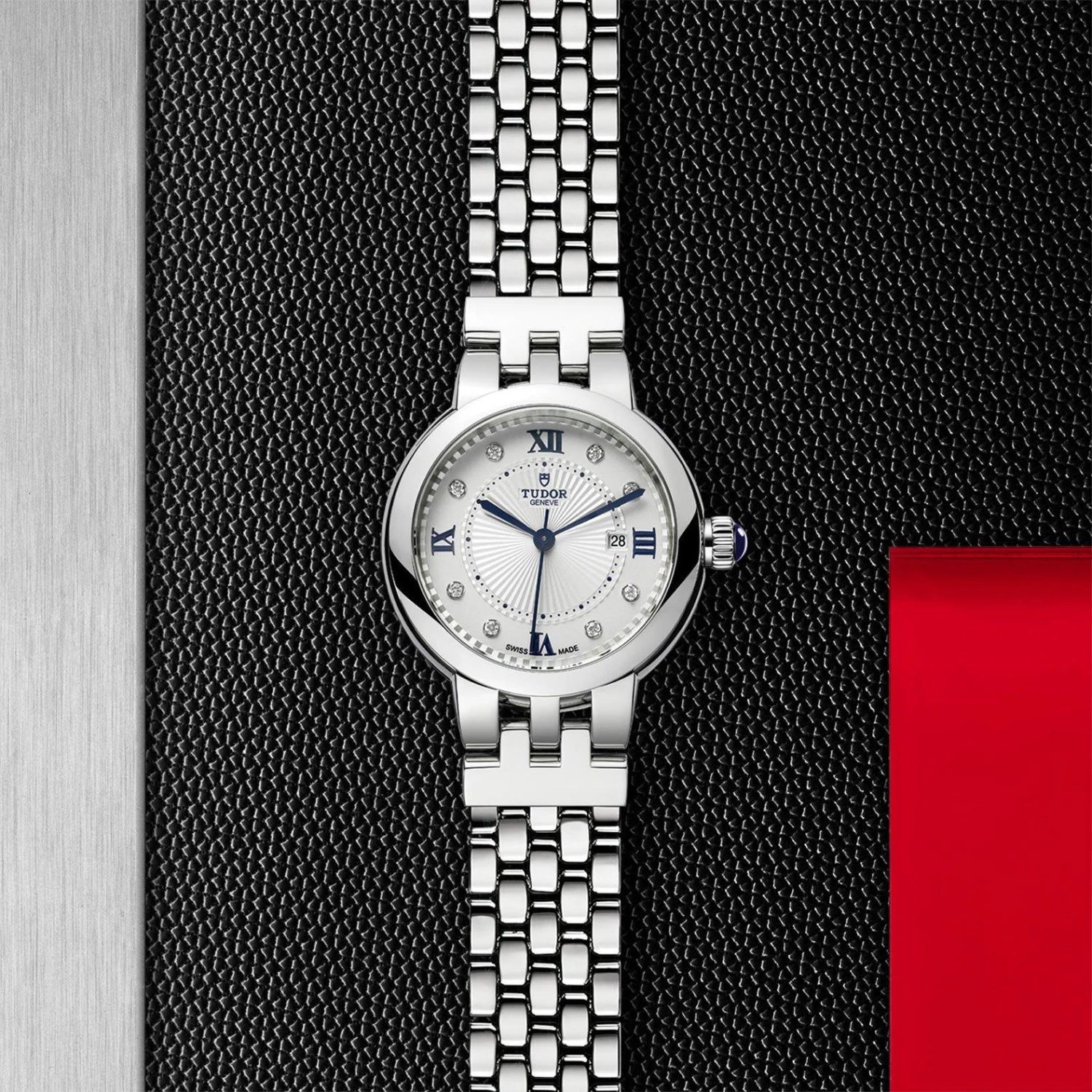 Showcasing superior Swiss craftsmanship, this sophisticated Tudor Clair De Rose 30 Diamond Automatic Ladies Watch is beautiful on the outside and technical on the inside. We love the diamond embellished dial and the vintage blued hands.