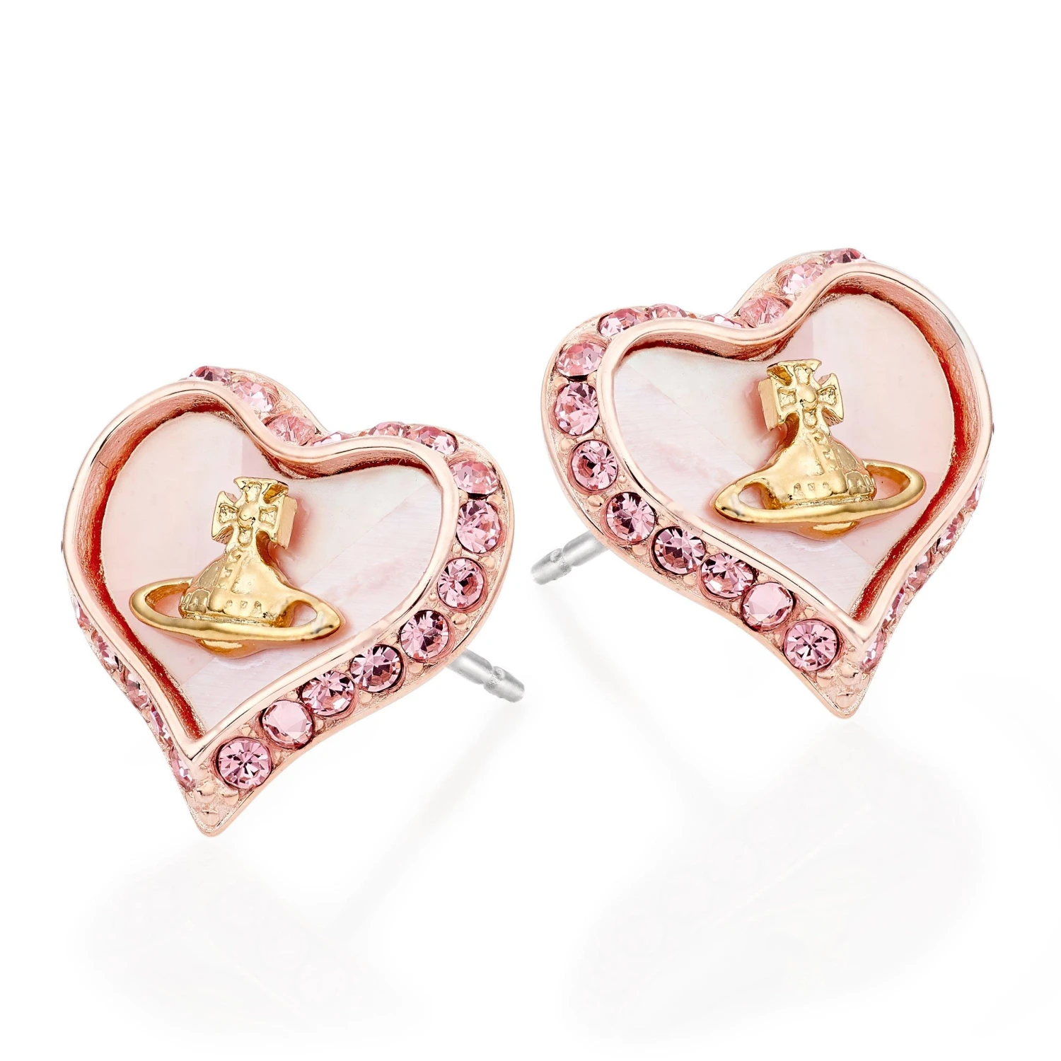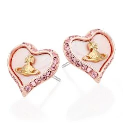 These Vivienne Westwood Petra Pink Stud Earrings feature the iconic orb in gold centred on a pink mother-of-pearl asymmetrical heart. Adorned with a pink encrusted border these earrings are bound to stand out.