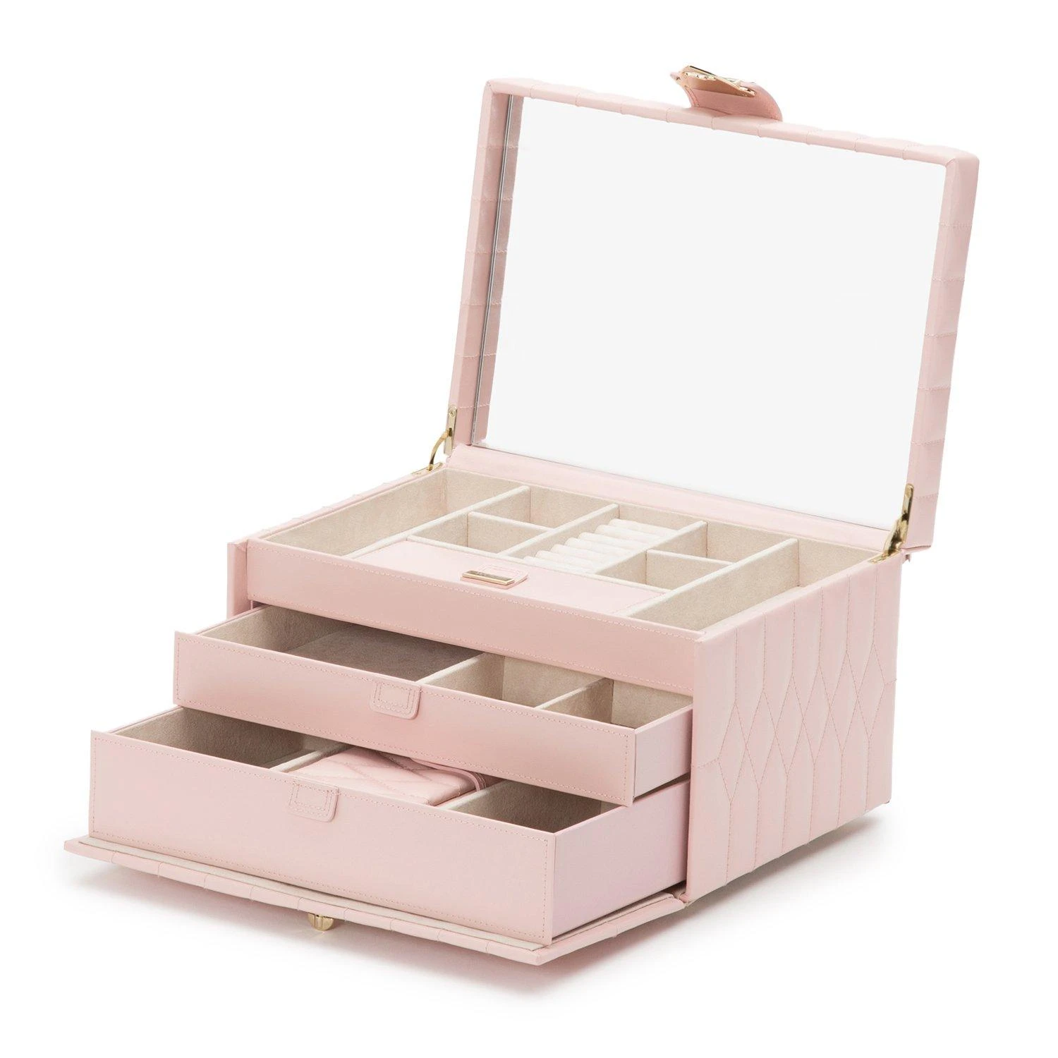 This WOLF Caroline Rose Quartz Medium Jewellery Box is a timeless classic, featuring elegant soft lines of the 50’s and gold tone hardware. This refined case is the perfect home for your precious jewellery.